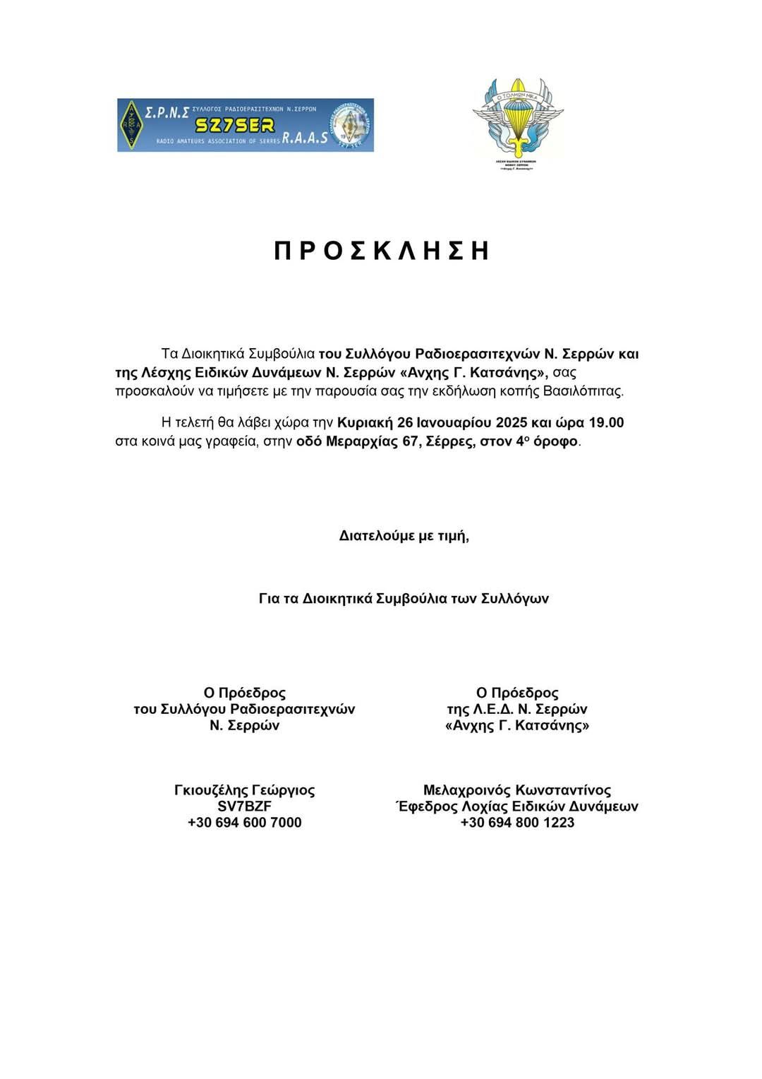 Οι Πρόεδροι των Συλλόγων, Σύλλογος Ραδιοερασιτεχνών Ν. Σερρών & Λ.Ε.Δ. Ν. Σερρών "Ανχης Γ. Κατσάνης" σας καλούν να τιμήσετε με την παρουσία σας την κοπή της Πρωτοχρονιάτικης Βασιλόπιτας την Κυριακή 26 Ιανουαρίου 2025 και ώρα 19:00 στο γραφείο μας Μεραρχίας 67, Σέρρες.