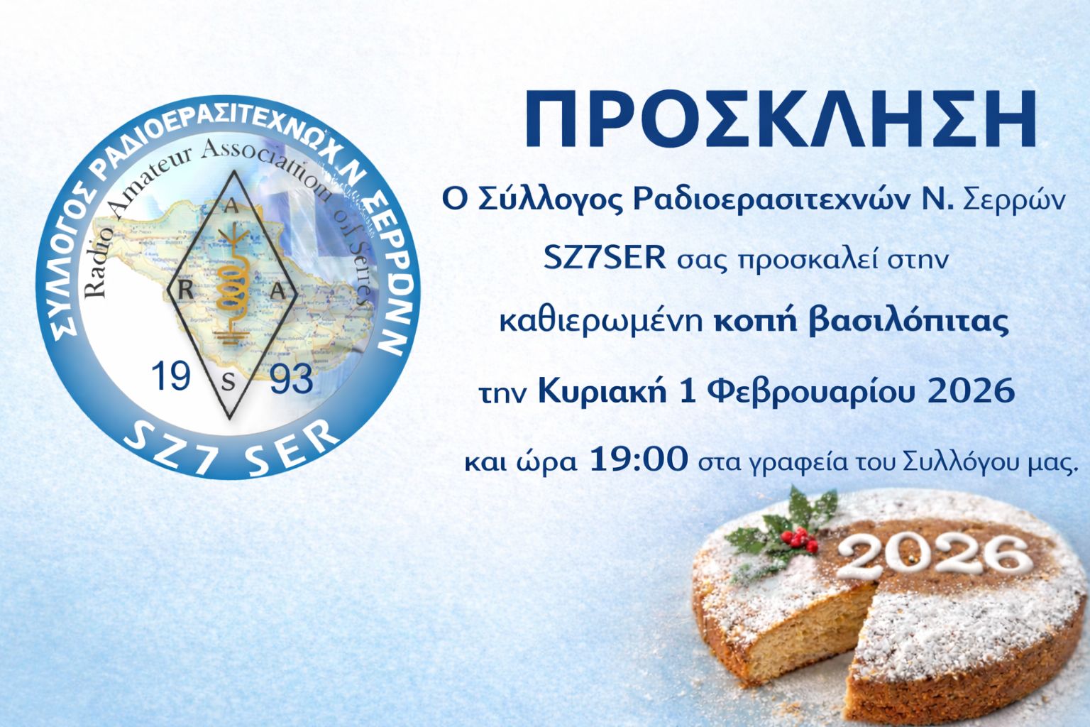 Ο Σύλλογος Ραδιοερασιτεχνών Ν. Σερρών SZ7SER σας προσκαλεί στην καθιερωμένη κοπή βασιλόπιτας την Κυριακή 1 Φεβρουαρίου 2026 και ώρα 19:00 στα γραφεία του συλλόγου μας.